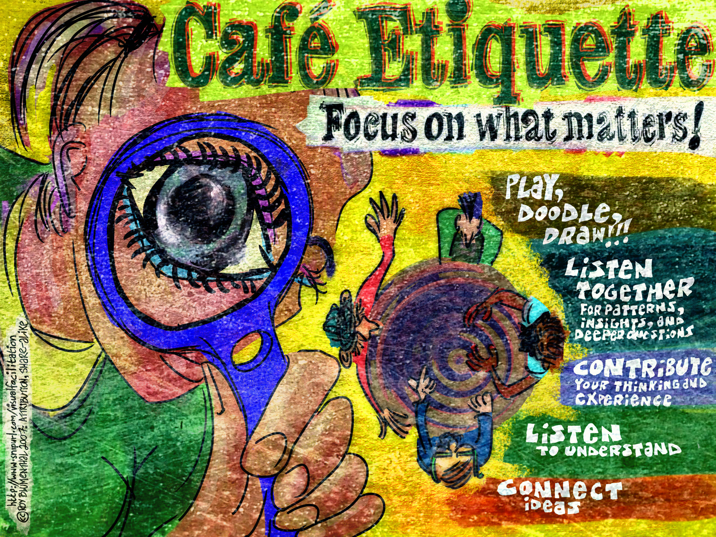 A rather bold and colourful version of one of the World Cafe graphics. It details the etiquette people should follow. Free to use and change as you see fit. Works better printed than projected. Cos it's busy busy busy.